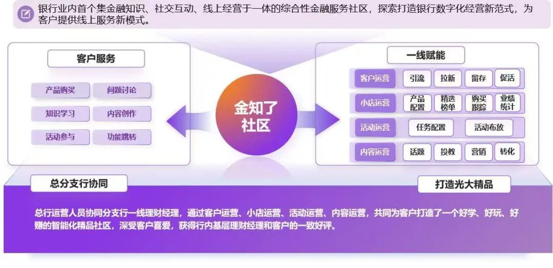 本次获得二等奖的“基于智能搜推的互联网金融社区建设项目”,打造了业内首个集金融知识、社交互动、线上经营探索等能力于一体的综合性金融服务社区——“金知了”社区。项目使用AI算法进行内容标签自动提取,形成智能化内容社区,支持客户与理财经理在社区内一对一、一对N、N对一、N对N的交流互动,为客户提供千人千面的内容和产品服务,赋能理财经理数字化经营,实现线上线下一体化的经营模式。二等奖项目“公共数据资源场内交易模式探索与实践”项目以公共数据资源为主要对象,聚焦商业银行公共数据资源应用难题,拓展新的业务模式和赛道。