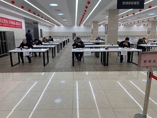 ▲园区内各职能单位员工分时段在食堂指定区域用餐,餐厅座位改为单排单向